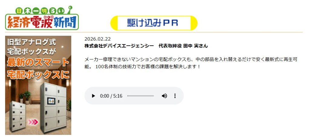 株式会社くじらリアルエステートテック(本社:大阪市西区)は、2026年2月22日に放送されたMBSラジオ「日本一明るい経済電波新聞」内のコーナー「駆け込みプロモーション」において、当社が開発・販売する「くじらスマート宅配ボックス リプレイスパッケージ」が紹介されたことをお知らせいたします。